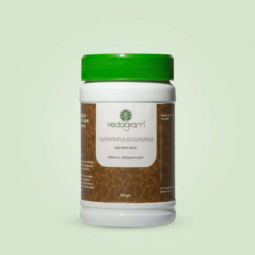 Ajamamsa Rasayanam is a herbal jam that contains Ajamansa, Ashwagandha, and Kapikacchu, which can help promote body mass and strength. It provides essential nutrients to the body. It can enhance immunity, vitality, and vigour.