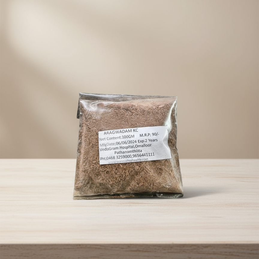 Aragwadham Kashaya Choornam is a traditional Ayurvedic powder used to prepare a herbal decoction that supports skin health and detoxification. It is known for its cleansing, cooling, and anti-inflammatory properties.