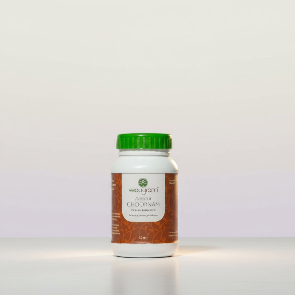Avipathi Choornam is a classical Ayurvedic herbal powder known for its cooling and detoxifying properties. It is commonly used to relieve acidity, burning sensation, and constipation while supporting healthy digestion.