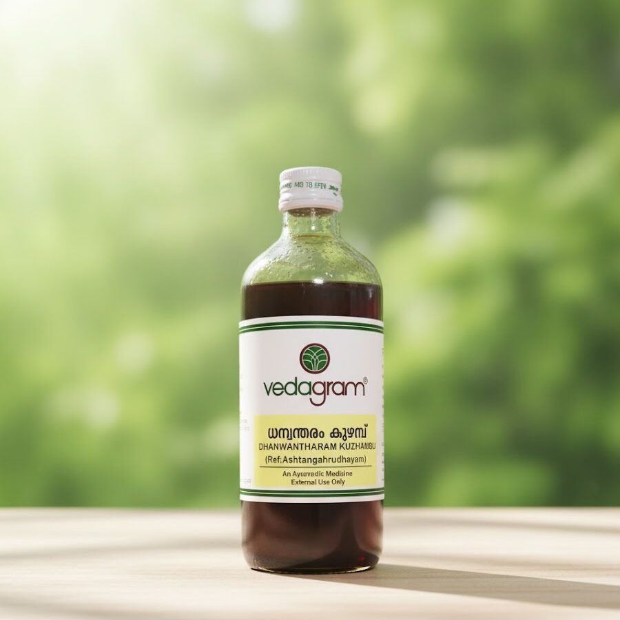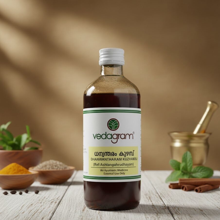 Dhanwantaram Kuzhampu is a classical Ayurvedic oil prepared with nourishing herbs to support joint health, relieve body pain, and strengthen muscles and nerves. Widely used for postpartum care and general rejuvenation.