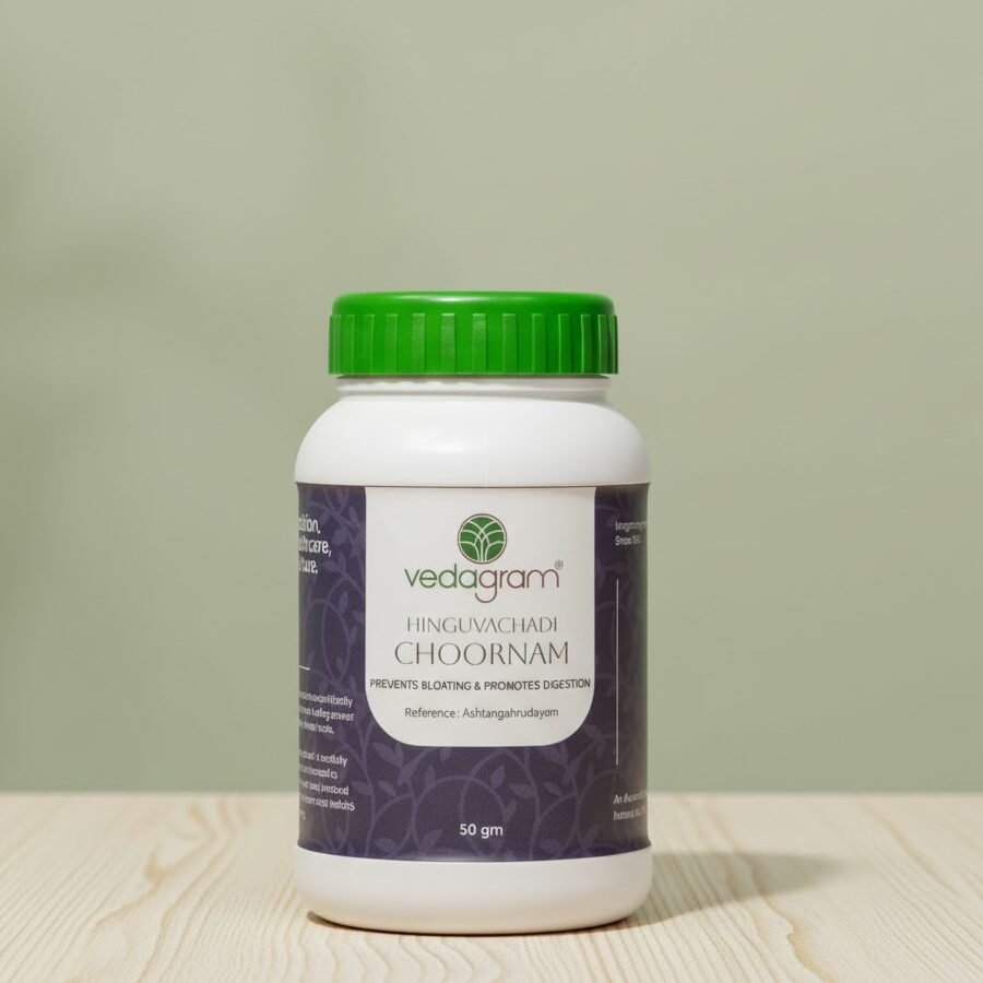 Hinguvachadi Choornam is a classical Ayurvedic digestive powder formulated with herbs like Hingu and Jeeraka to relieve gas, bloating, abdominal discomfort, and indigestion. It supports smooth digestion and gut balance.