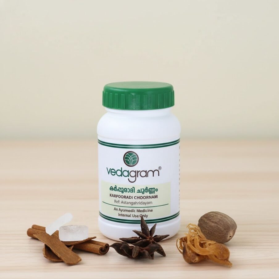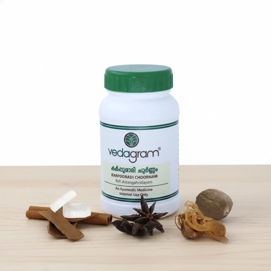 Karpooradi Choornam is a traditional Ayurvedic powder formulated with camphor and aromatic herbs to support respiratory and nasal health. It helps clear congestion, reduce heaviness in the head, and ease breathing discomfort.