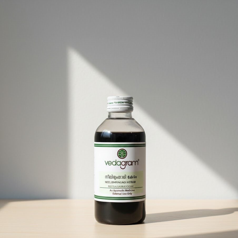 The Neelibringadi keram is a luxurious blend of coconut oil and precious ayurvedic herbs like indigo or neeli, false daisy, also called bringaraj, winter cherry, or karnasphota, and gooseberry, commonly called amla is formulated to cover all your hair and scalp concerns such as dandruff, premature greying, and hair fall.