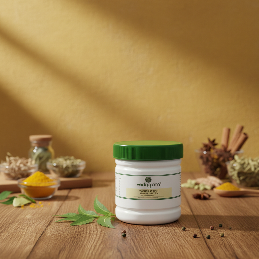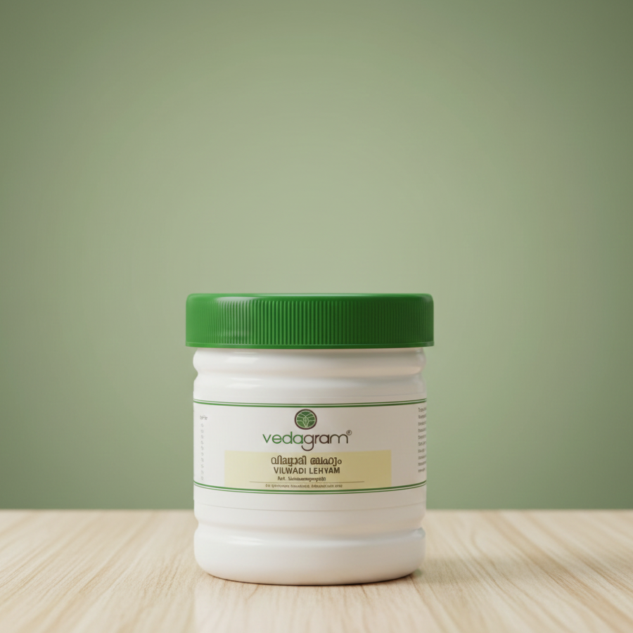 Vilwadi Lehyam is a traditional Ayurvedic herbal paste used to support digestion, respiratory health, and natural detoxification. Its balanced ingredients help reduce digestive discomfort, ease respiratory symptoms, and promote overall wellness.